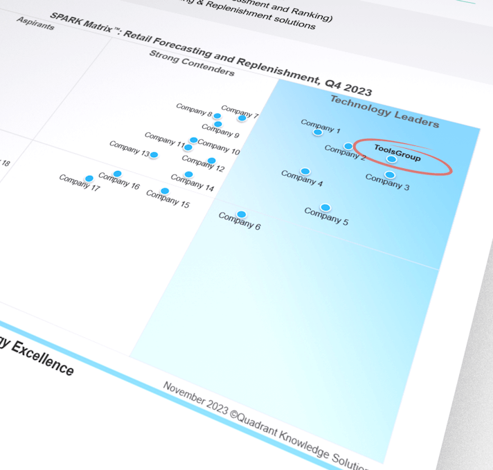 December 2023 – ToolsGroup, a global leader in retail and supply chain planning and optimization software, is proud to announce it has been named a technology leader in the in the SPARK Matrix™️ analysis of Intelligent Retail Pricing and Promotion Optimization (IRP&PO) by Quadrant Knowledge Solutions (QKS).
